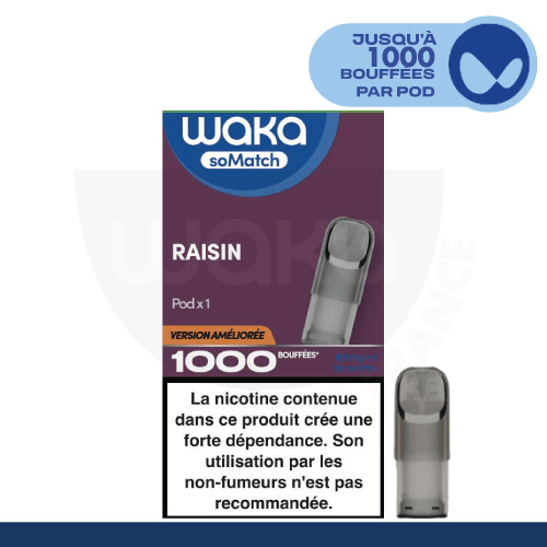 Le Pod Waka soMatch saveur Raisin Glacé, disponible uniquement en 9,9 mg de nicotine dans chaque pod pré-rempli.